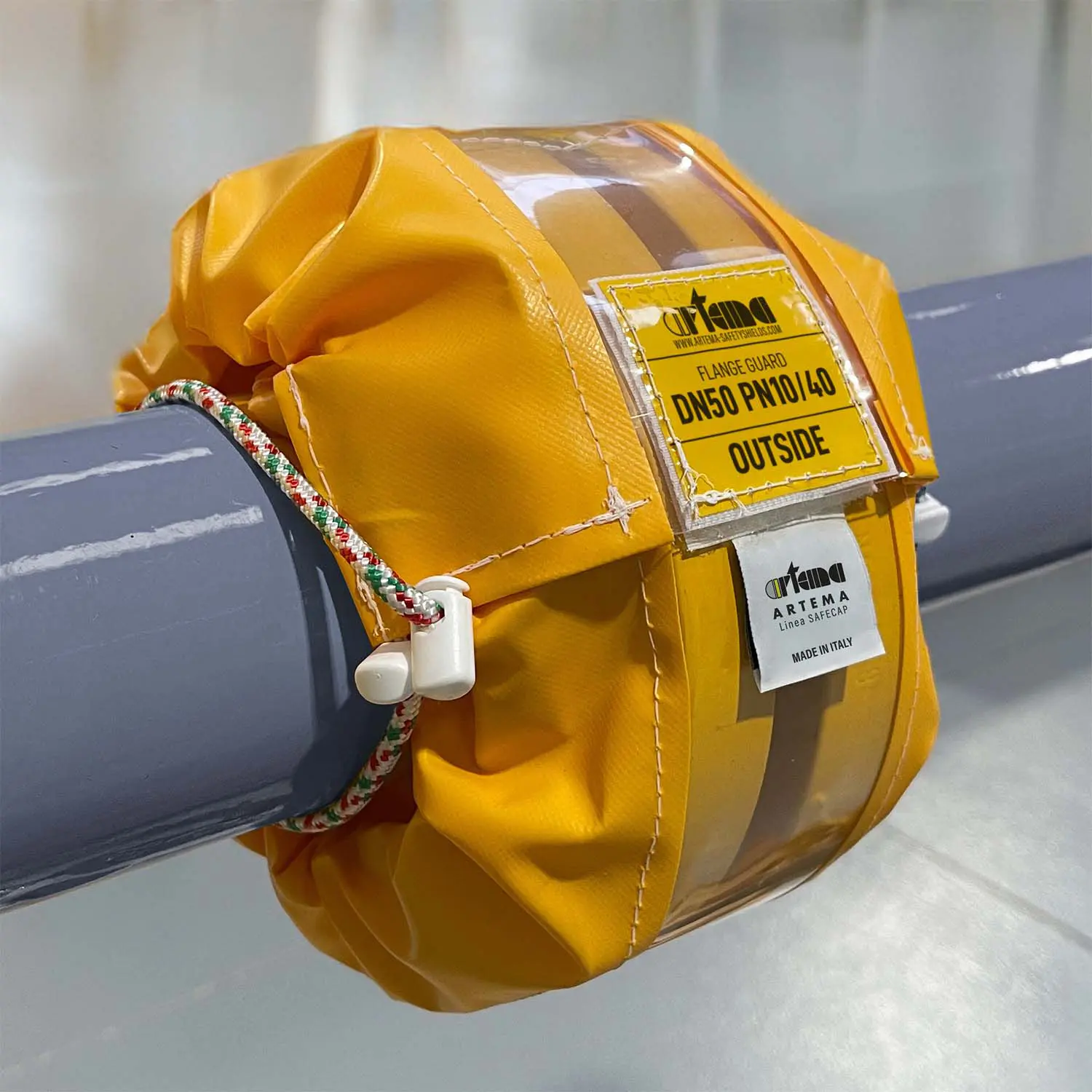 die gelbe Farbe macht den Flanschschutz aus der Entfernung sichtbar