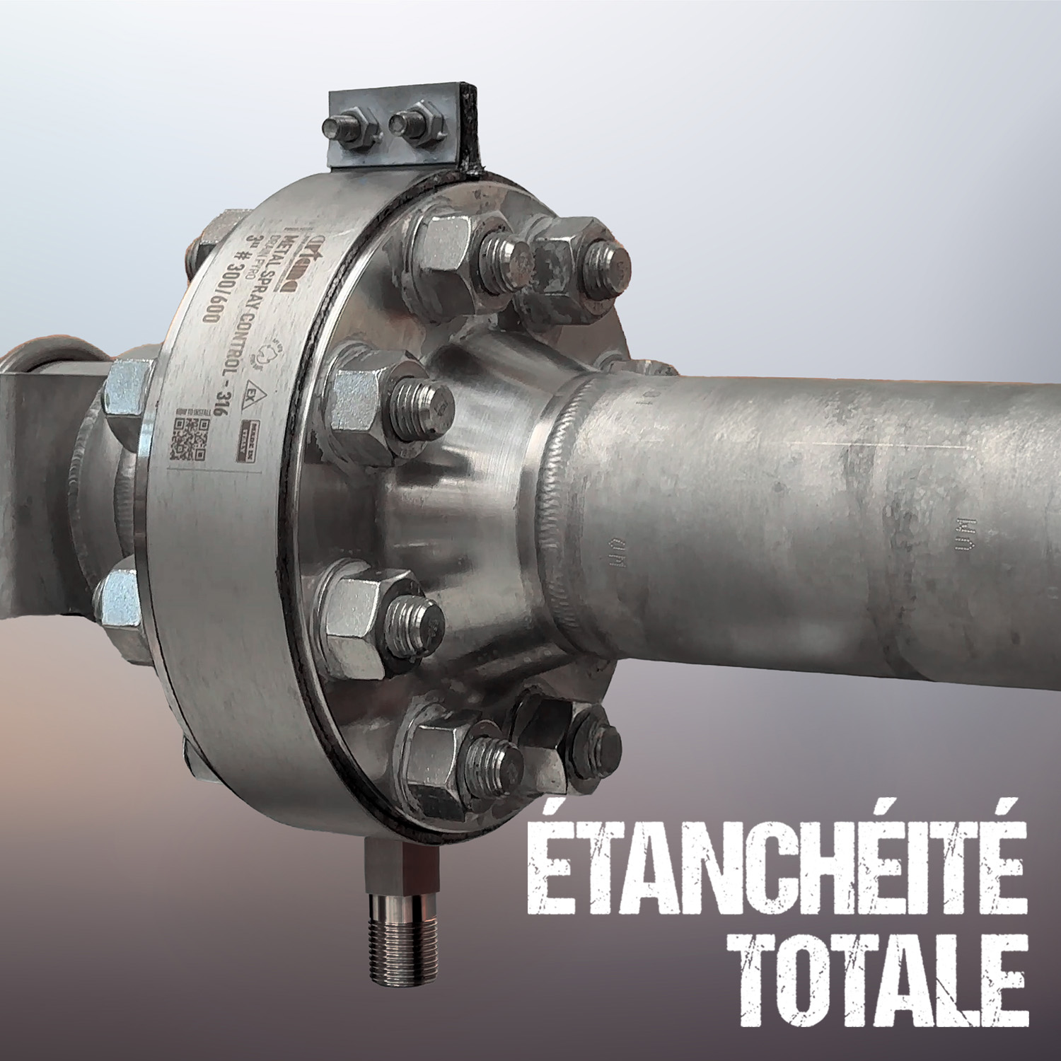 Le cache-bride MSC DRAIN PYRO - V2 est adapté à l'installation dans les zones ATEX et résiste à des températures extrêmement élevées (jusqu'à +650 °C). Le ruban d'étanchéité en graphite permet d'assurer une étanchéité totale et le tuyau de drainage achemine le fluide en cas de fuite.